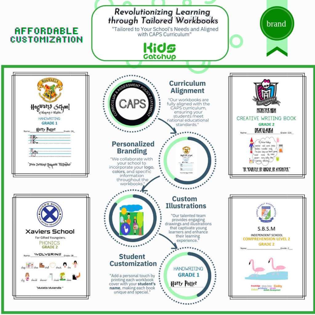 With Kidscatchup, you can create personalized learning materials that reflect your school’s identity and meet your curriculum needs. Our custom workbooks are designed to be engaging, comprehensive, and aligned with CAPS requirements, helping your students thrive in the classroom and beyond.